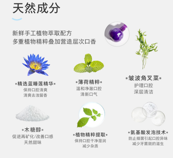 香型:前調--印度薄荷,后調--復合花語(yǔ)功能:?jiǎn)拘芽谠芰?賦予口腔清新動(dòng)力 祛火,口氣清新,祛除口腔異味精選:小巨蛋稀世天材庫中埃及藍睡蓮精華與白松露多肽成分,將奇幼賦活特性與藍睡蓮清新卓效完美糅合,加乘口腔滋潤清爽,驅濁香賦予口腔澎湃清新動(dòng)力。