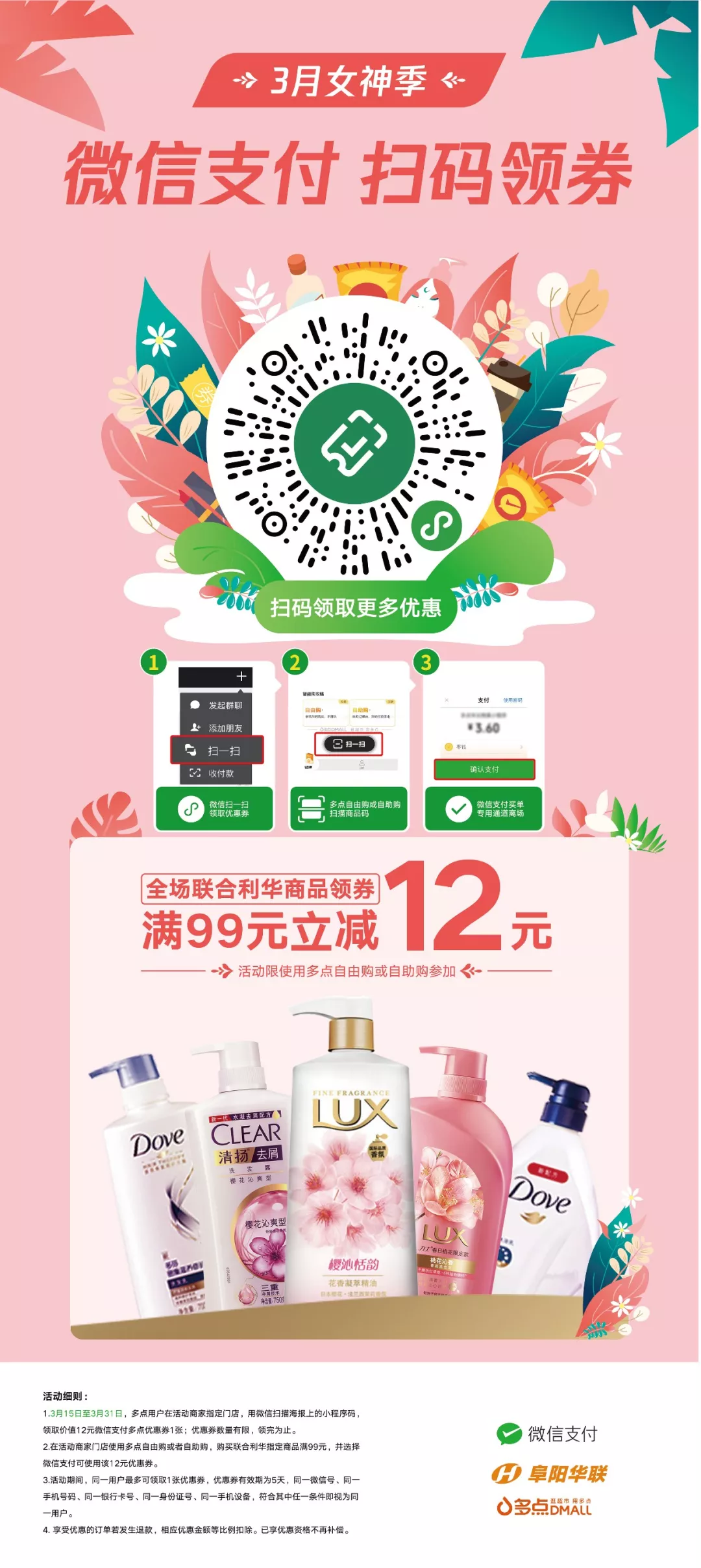 活動(dòng)細則:1、多點(diǎn)用戶(hù)在阜陽(yáng)華聯(lián)門(mén)店,微信掃描海報上的小程序碼,領(lǐng)取價(jià)值12元微信支付多點(diǎn)優(yōu)惠券1張;數量有限,領(lǐng)完為止。