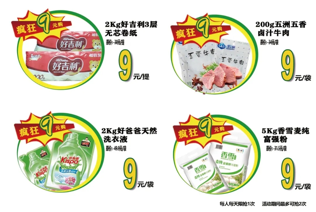 好吉利卷紙,五洲牛肉,好爸爸洗衣液,香雪麥純富強粉