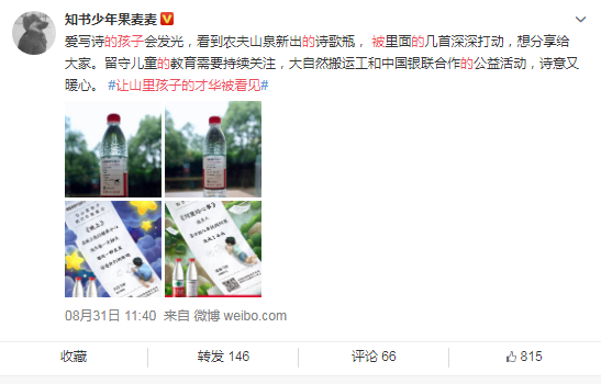 據了解,這次農夫山泉與中國銀聯(lián)合作推出的詩(shī)歌瓶,實(shí)際上是一次公益性質(zhì)的合作。