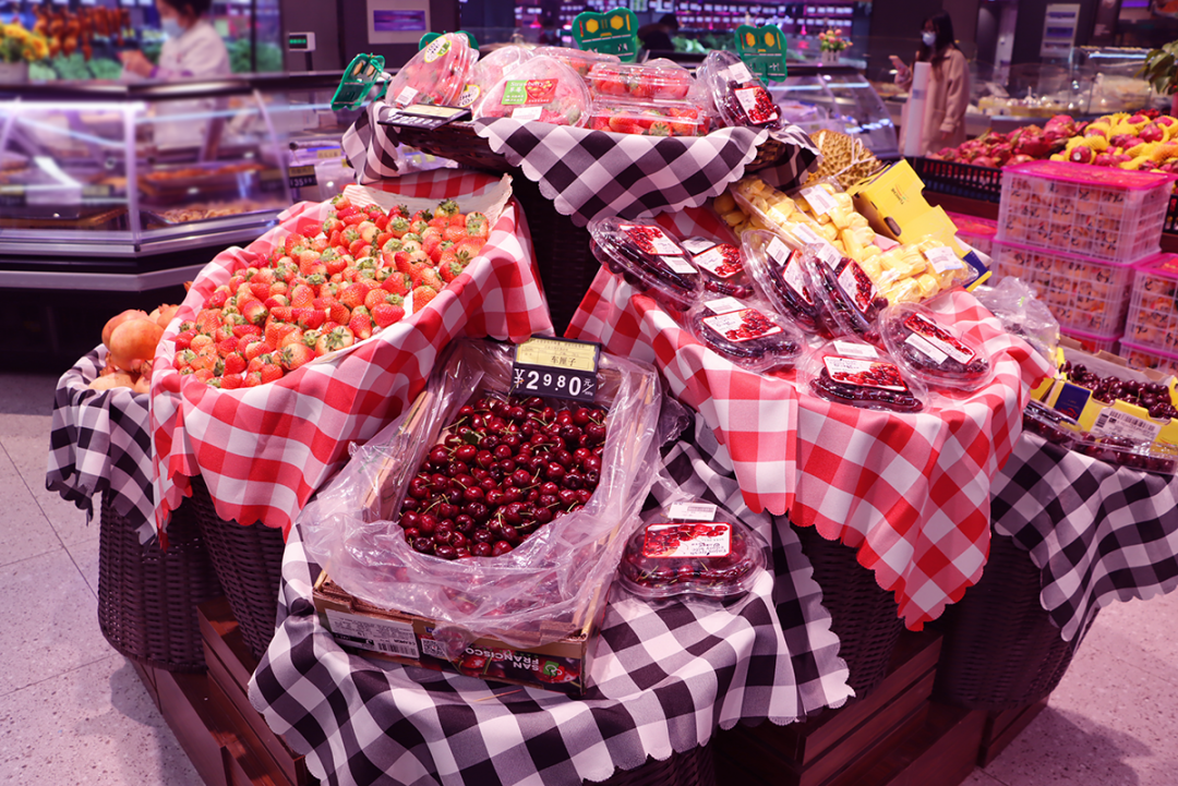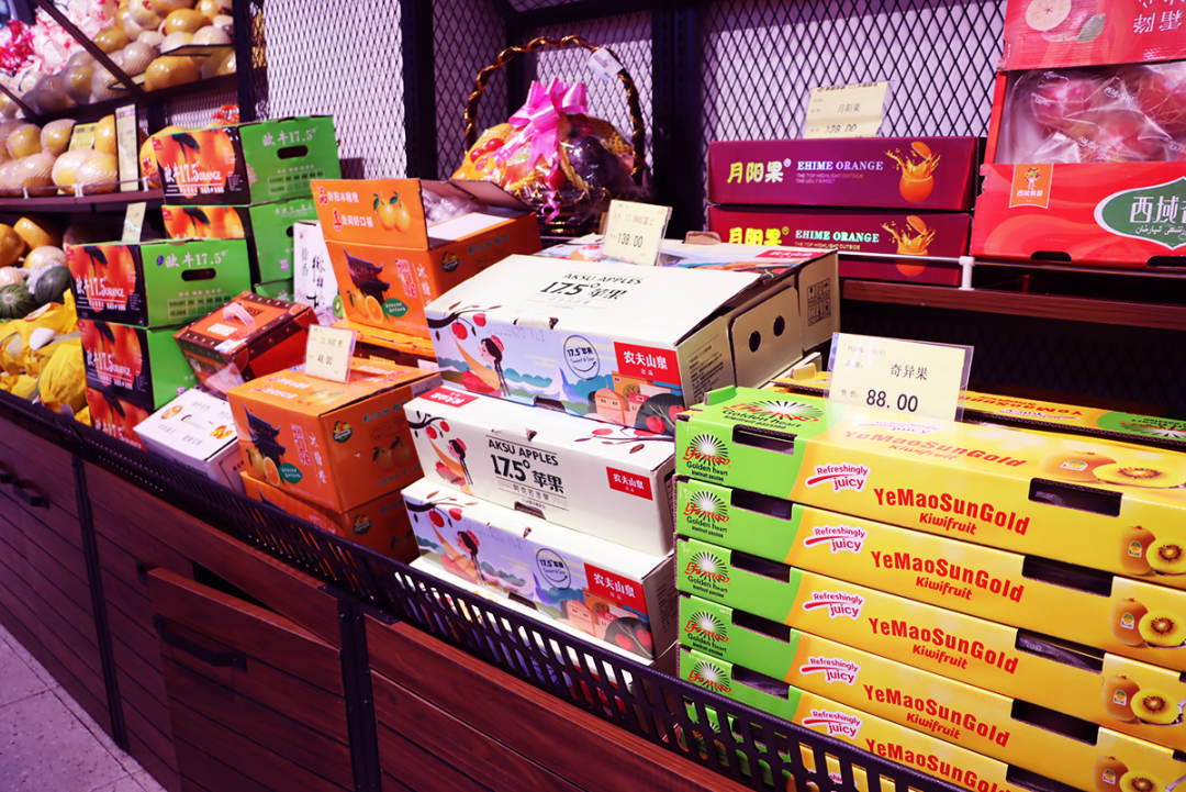 各種各樣的水果禮盒陳列在貨架上,