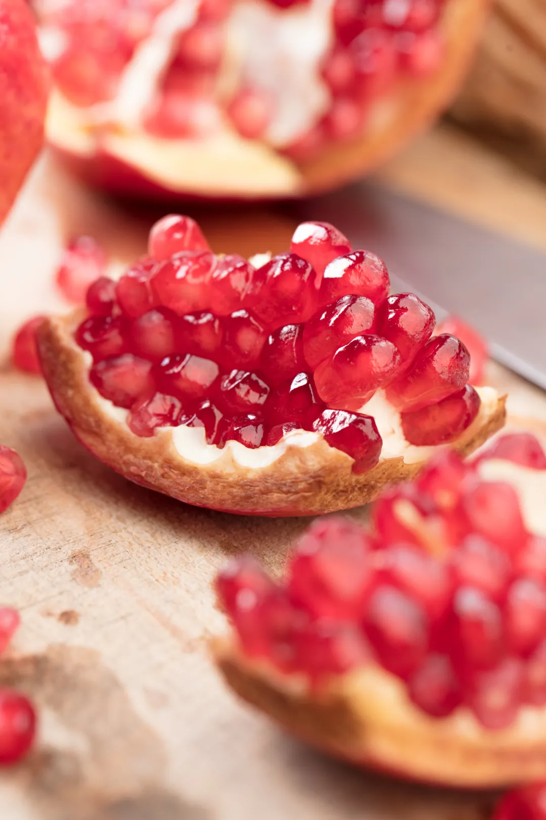 先用刀沿頂端開(kāi)口,再沿著(zhù)石榴內部紋路豎向劃6刀左右,即可直接用手掰開(kāi)