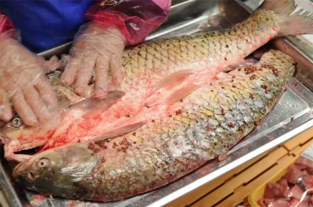 刮凈魚(yú)鱗的草魚(yú)被放上腌制臺,